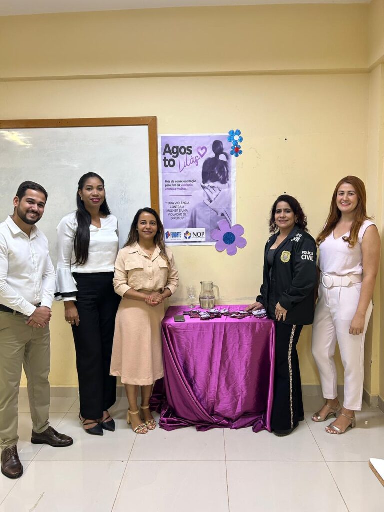 Coordenadora da unidade de Janaúba da DPMG, defensora pública Claudijane dos Santos Gomes (3° posição, à esquerda), acompanhada pela delegada da delegacia especializada em crimes contra a mulher, Márcia Meire (2° posição, à direita), e outros participantes do evento