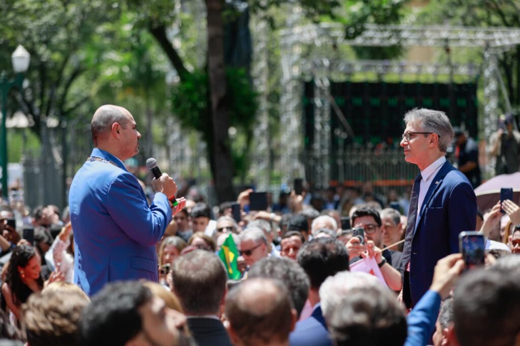 Zema, que encerra sete anos à frente do Estado, recebeu o sucessor e a primeira-dama e presidente do Servas, Christiana Renault, no palco montado para a solenidade. Depois da execução do Hino Nacional pela Banda da PMMG, Romeu Zema entregou a Mateus Simões o Grande Colar da Inconfidência, a mais alta honraria concedida pelo Estado, simbolizando oficialmente a transmissão do cargo. Em seguida, ambos se pronunciaram ao público presente e à população mineira.