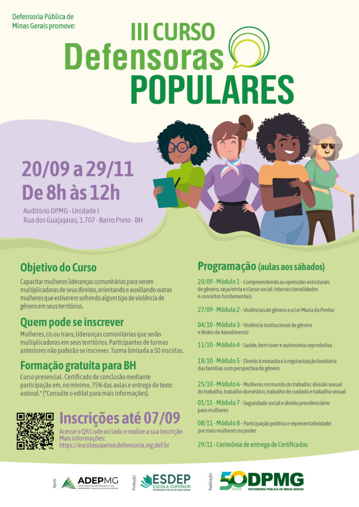 A Defensoria Pública de Minas Gerais (DPMG), por meio de sua Escola Superior (ESDEP-MG), promove o III Curso Defensoras Populares, iniciativa voltada para a formação de mulheres lideranças comunitárias que atuarão como multiplicadoras dos direitos das mulheres em seus territórios.