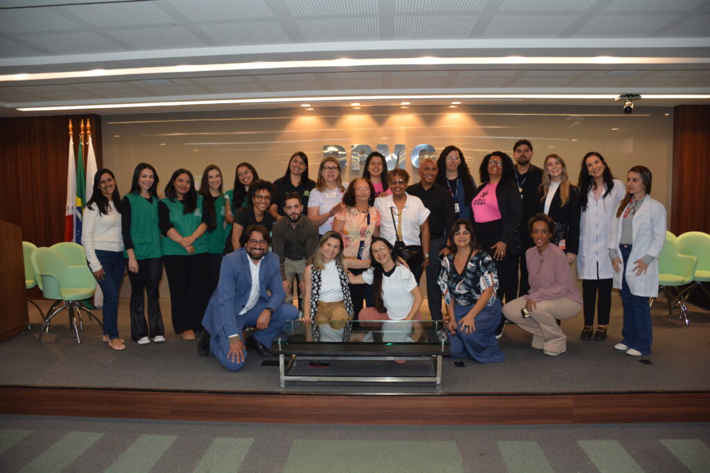 A defensora pública Fernanda Fernandes, o defensor público Luis Renato, servidores e estagiárias da DPMG junto a parceiros na realização do “Dia do Cuidado”