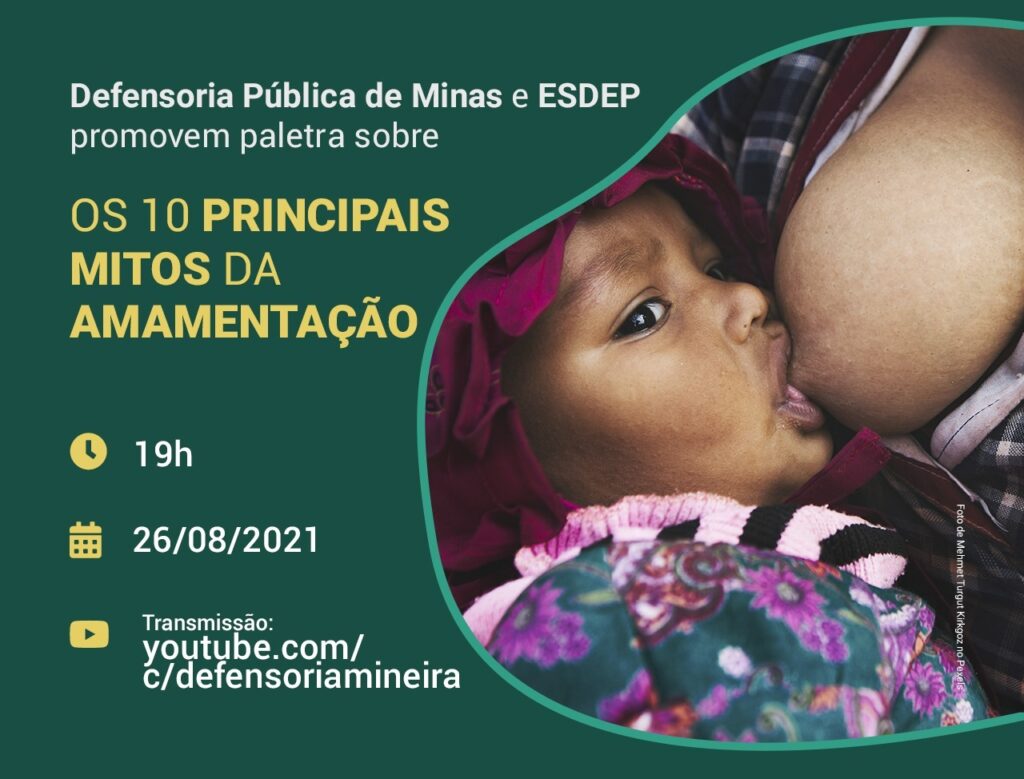 A Defensoria Pública de Minas Gerais (DPMG), por meio da sua Escola Superior (Esdep), promoverá a palestra virtual “Os 10 principais Mitos da Amamentação”. O evento acontece no dia 26/8 (quinta-feira), às 19 horas, com transmissão pelo canal do YouTube da DPMG (c/defensoriamineira).