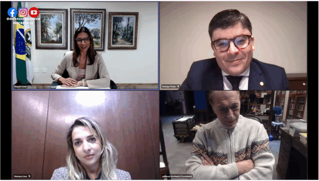 A palestra “Os 34 anos da Constituição Brasileira – Colonialismo, direitos humanos e totalitarismo financeiro” foi transmitida ao vivo na noite desta quinta-feira (6/10), pelo canal do YouTube da DPMG. A defensora pública-geral de Minas Gerais, Raquel da Costa Dias, abriu o evento, que teve como palestrante o jurista argentino Eugenio Raúl Zaffaroni, referência no Direito.
